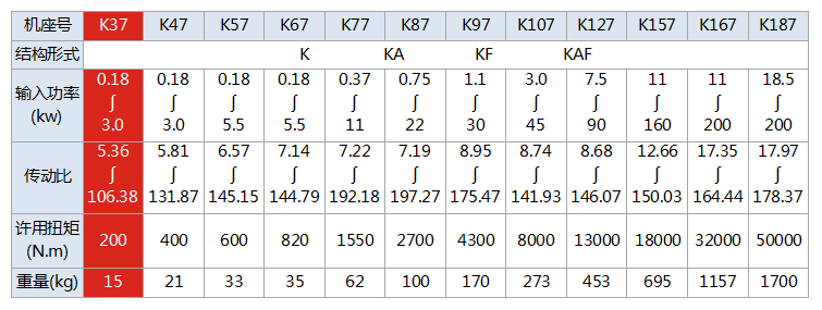 K系列減速機,結合國際技術要求制造,具有很高的科技含量,節省空間,可靠耐用, 承受過載能力高,功率可達200Kw,能耗低,性能優越,減速機效率高達95%以上,振動小,噪音低,節能高,選用優質鍛鋼材料,鋼性躊鐵箱體,齒輪表面 經過滲碳淬火,經過精密加工,構成了斜齒輪、傘齒輪,錐齒輪傳動總成的減速機。